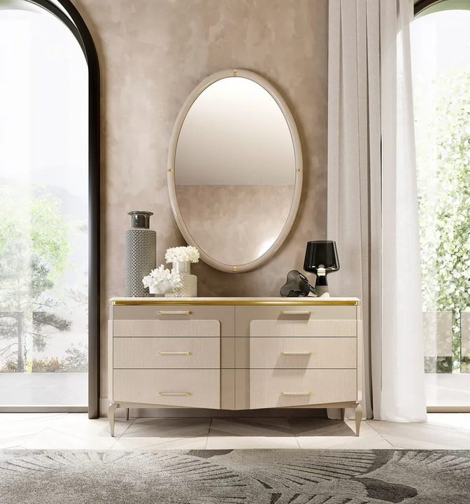 Дизайн зеркала VICTOR воплощает современный стиль, безупречно интегрируя традиционное мастерство с современными элементами дизайна. Его овальная форма и минималистичные линии создают поразительный визуальный эффект, делая его центром внимания в любой комнате. Эстетика, отличающаяся изысканностью, дополнительно подчеркивается роскошными материалами и тонкой отделкой зеркала, отражающими приверженность как красоте, так и функциональности.