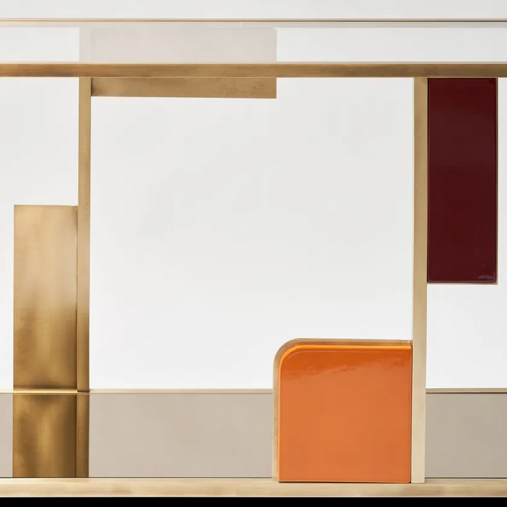 Дизайн Прямоугольного консольного стола из латуни отличается вниманием к деталям, от сложных декоративных элементов из глазурованной керамики до гладких линий латунной конструкции. Стеклянная верхняя часть позволяет прозрачный обзор декоративного зеркала снизу, создавая иллюзию пространства и света. Общая эстетика — это идеальное сочетание элегантности и современности, что делает его выдающимся предметом в любой комнате.