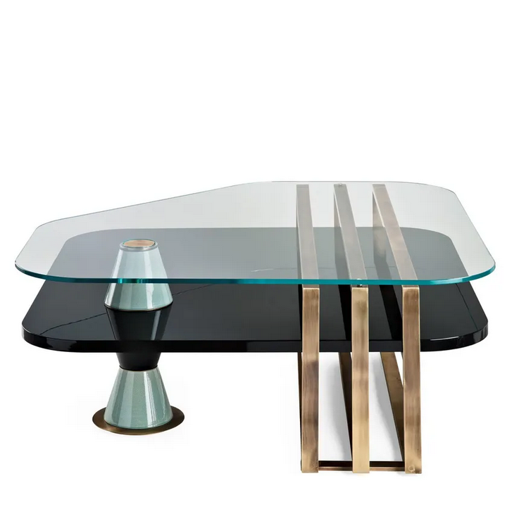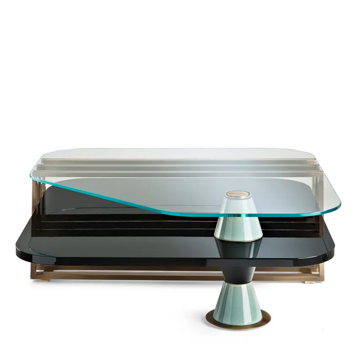 Дизайн и эстетика квадратного кофейного столика характеризуются вниманием к деталям и элегантной форме. Конструкция из обработанной латуни добавляет нотку утонченности, в то время как двухцветные глазурованные керамические опоры предоставляют уникальный поворот на традиционный дизайн. Стеклянная столешница с повышенной прозрачностью не только позволяет легко видеть красивые материалы под ней, но и создает открытое и воздушное ощущение в вашем жилом пространстве.