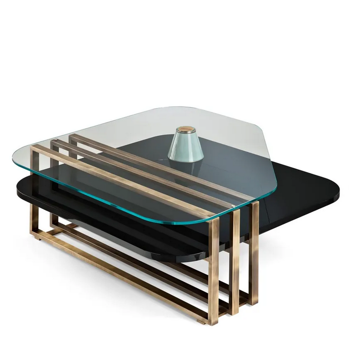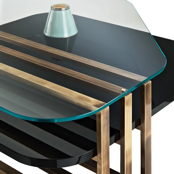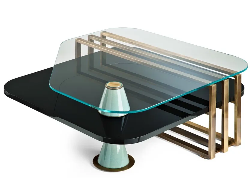 Изготовленный из высококачественных материалов, этот кофейный столик представляет собой комбинацию стекла, лакированного дерева, латуни и керамики. Лаковая отделка обеспечивает гладкую, блестящую поверхность, которая не только визуально привлекательна, но и легко очищается. Каждый материал был выбран за его устойчивость и долговечность, что гарантирует соответствие этого изделия международным стандартам сертификации по экологии. Использование ответственно добытых древесины и металла обеспечивает долговечность, делая этот кофейный столик выгодным вложением для вашего дома.
