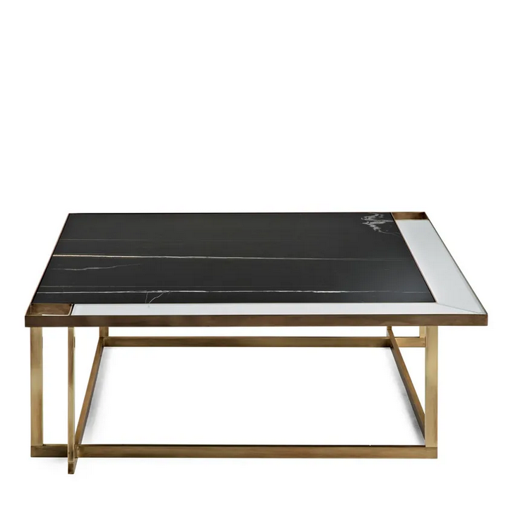 Элегантный квадратный кофейный столик демонстрирует тщательное внимание к деталям, начиная от его стройных латунных ножек и заканчивая утонченным мраморным верхом. Углубленный дизайн столешницы добавляет глубины и интереса, в то время как комбинация материалов создает выразительный контраст, который привлекает взгляд. Этот столик не только функциональный предмет мебели, но и заявление о стиле и утонченности.