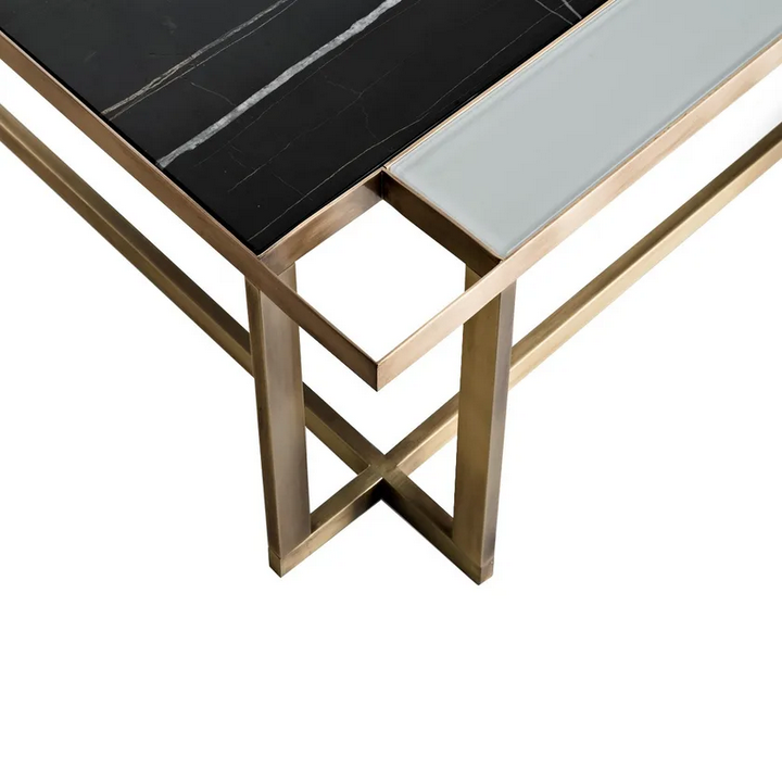 Этот кофейный столик воплощает современный стиль, характеризующийся чистыми линиями и геометрическими формами. Сочетание традиционной латуни с современными мраморными и стеклянными элементами создает уникальный визуальный эффект, который улучшает любое жилое пространство. Сбалансированные пропорции и элегантный силуэт стола делают его вечным дополнением вашего дома.