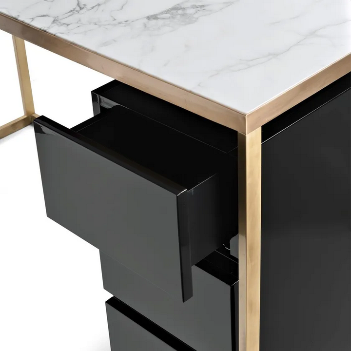 Письменный стол выполнен из высококачественных материалов, включая массивную бронзу, мрамор и стекло. Бронзовая рама обеспечивает прочность и долговечность, в то время как мраморная столешница добавляет роскоши. Лакированные деревянные ящики не только эстетически приятны, но и обеспечивают достаточное пространство для хранения офисных принадлежностей. Все используемые материалы являются экологически чистыми и соответствуют международным стандартам устойчивого развития, что гарантирует, что ваша покупка будет стильной и ответственной.