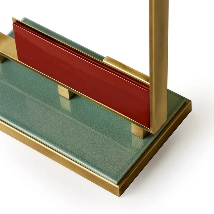 Изготовленная из высококачественной латуни и керамики, эта лампа олицетворяет прочность и стиль. Брашированная отделка добавляет легкую текстуру, подчеркивающую визуальную привлекательность, в то время как глазурованные плитки тщательно обработаны для обеспечения гладкой и блестящей поверхности. Все используемые материалы экологически чистые и соответствуют международным стандартам устойчивого развития, что отражает приверженность ответственной производственной практике и экологической осознанности.