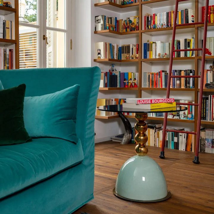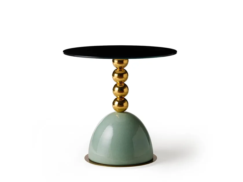 Столик с керамическими сферами из латуни и стекла от MARIONI является потрясающим центром современных интерьеров. Этот столик сочетает в себе ретро-лакированную стеклянную верхнюю часть с стильной основой, на которой расположены керамические глазированные сферы контрастных цветов. Уникальный дизайн не только служит функциональным аксессуаром, но и улучшает эстетическую привлекательность любого пространства. Идеален для гостиных, кухонь или в качестве прикроватного столика, он предлагает универсальность и элегантность в одном.