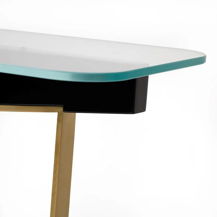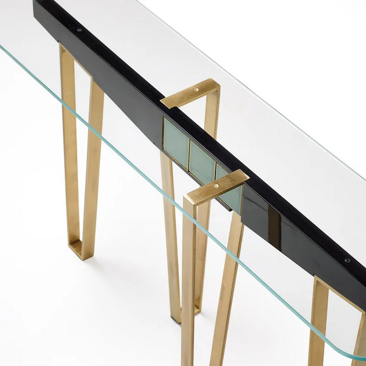 Дизайн Прямоугольного консольного стола отмечен его чистыми линиями и утонченным формами. Закругленные углы стеклянного верхней части смягчают общий вид, в то время как декоративные керамические плитки вводят художественный элемент. Внимание к деталям видно в бесшовной интеграции материалов, где латунная структура прекрасно контрастирует с лакированным деревом и стеклом, в результате чего получается единый и стильный предмет, который поднимает ваш домашний декор.