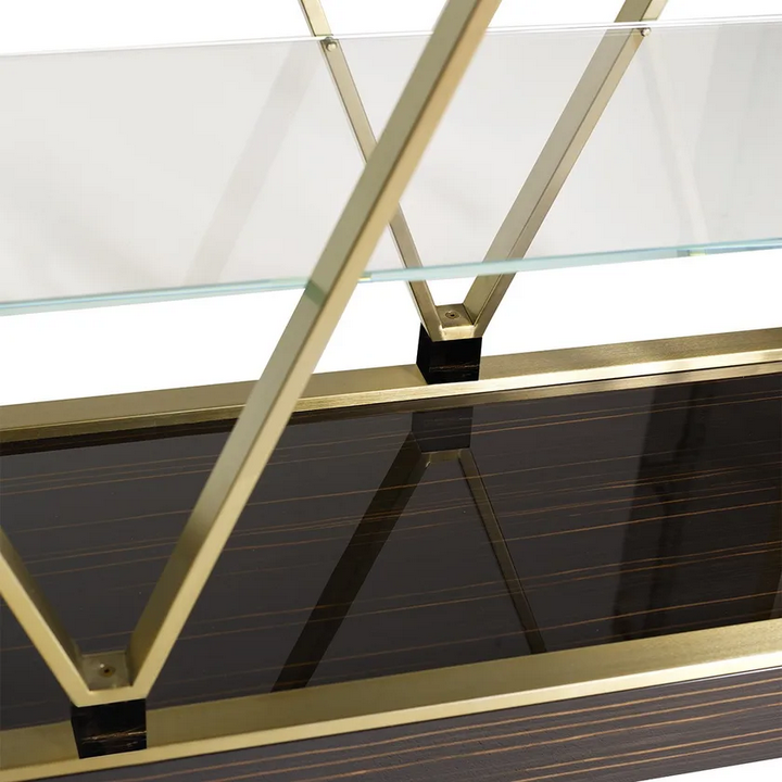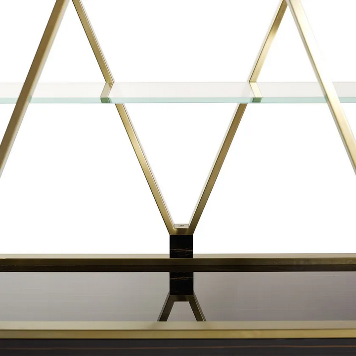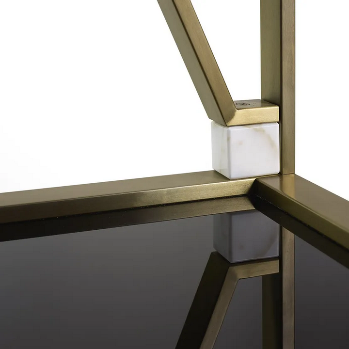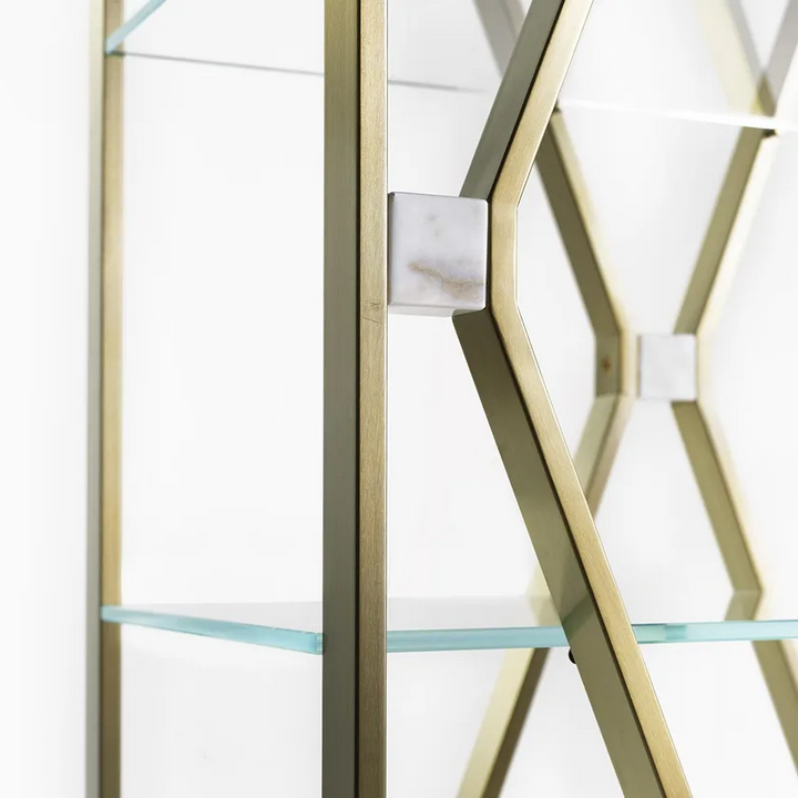 Книжная полка имеет тщательно проработанные детали, которые усиливают её общий эстетический привлекательность. Ромбовидная несущая структура не только визуально интересна, но и добавляет динамичный элемент в дизайн. Сочетание металла, дерева и мрамора создает утонченный вид, в то время как гладкие отделки обеспечивают тактильный опыт, который дополняет её визуальную привлекательность.