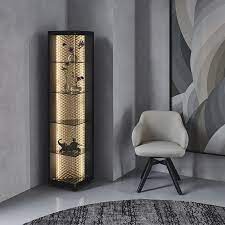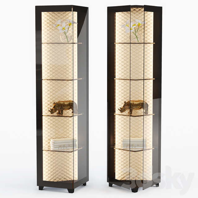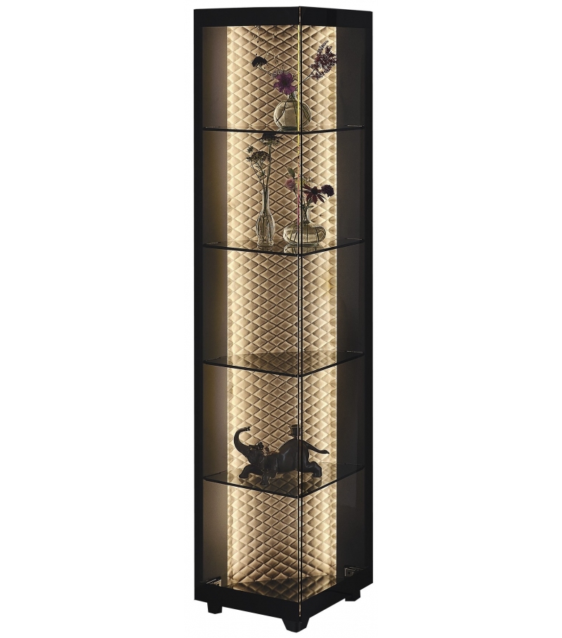 Витрина со структурой и ножками из окрашенной в черный цвет стали, дверцы и стенки из дымчатого стекла с полосами из окрашенного в черный цвет стекла. Верх и низ из черного окрашенного стекла с кислотным травлением, внутренняя задняя часть из эко-кожи или стеганой кожи в соответствии с картой образцов. Внутренние полки из дымчатого стекла. Светодиодное освещение в комплекте.