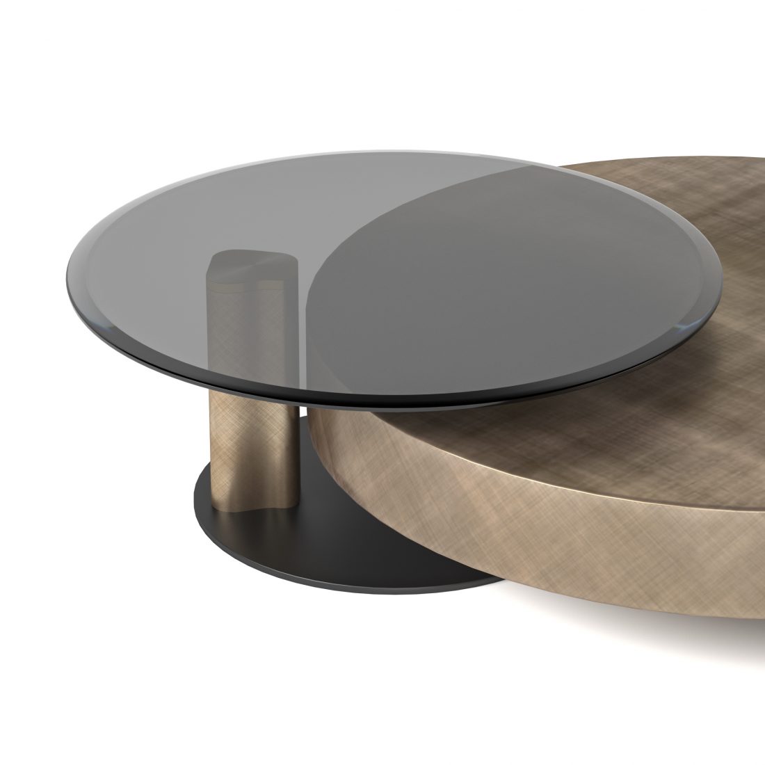 Журнальный столик с основанием из окрашенной в черный цвет стали и столешницей, окрашенной в матовый бронзовый или матовый серый цвет. Основной стол обрамлен одним или двумя столами с основанием из окрашенной стали с черным тиснением, колонной из стали, окрашенной в матовый бронзовый или серый цвет, и поворотной столешницей из дымчатого скошенного стекла.