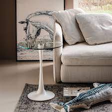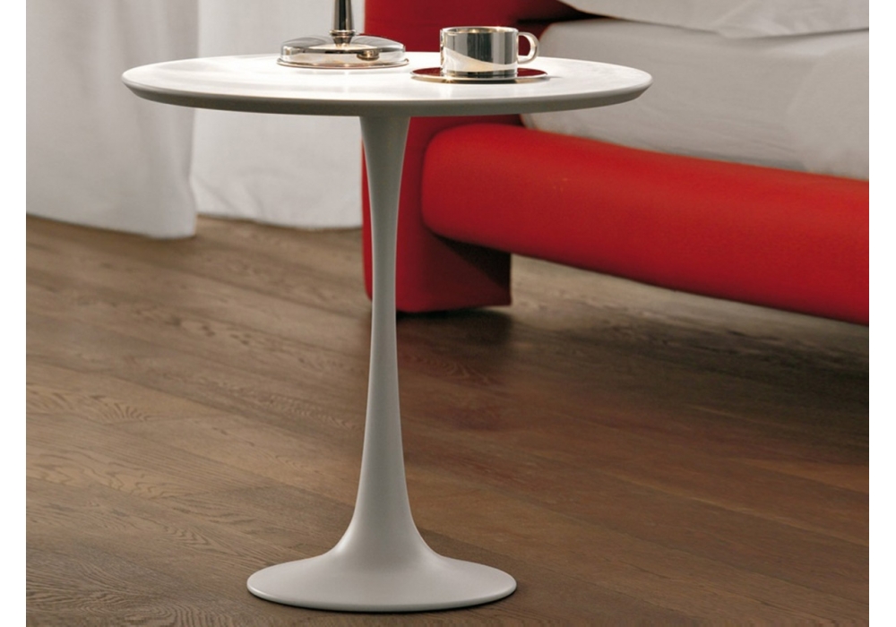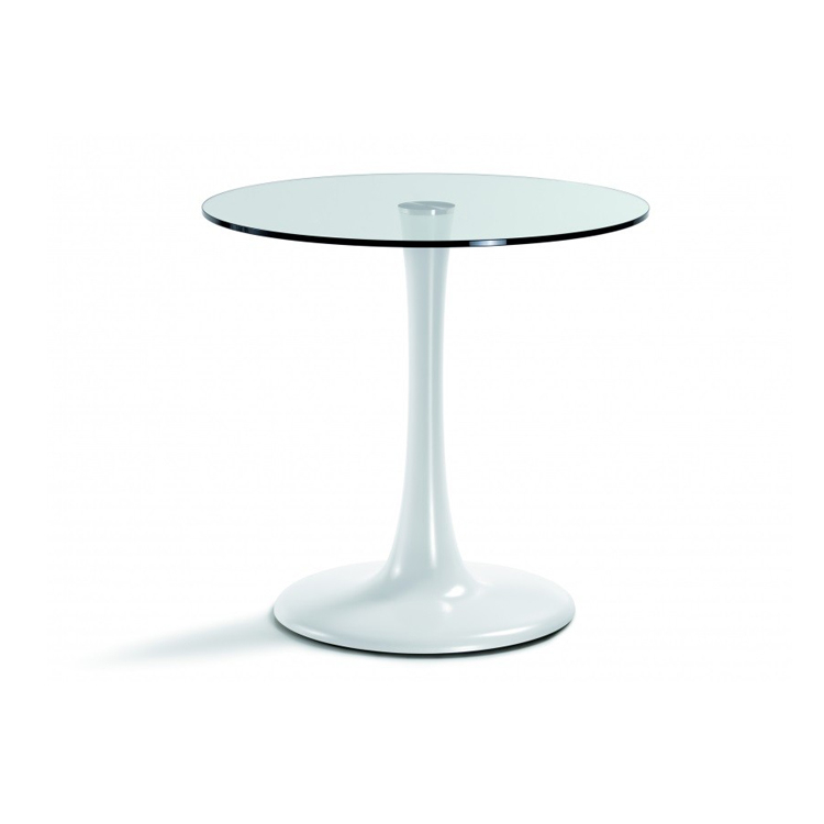 Журнальный столик с основанием из жесткого полиуретана, окрашенного в белый или черный цвет. Столешница из прозрачного стекла или белого или черного лакированного МДФ.