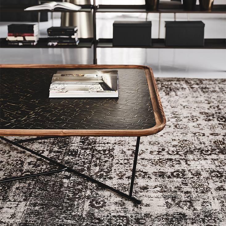 Журнальный столик со структурой из окрашенной стали с черным тиснением. Верхняя часть с краем из массива ореха каналетто и внутренняя часть из шпателя. Отделка материала по толщине производится вручную кельмой; каждая часть уникальна.
