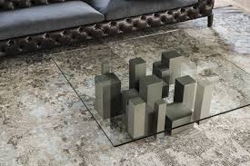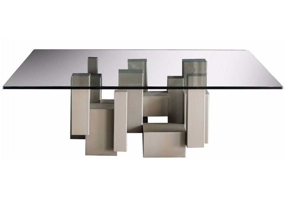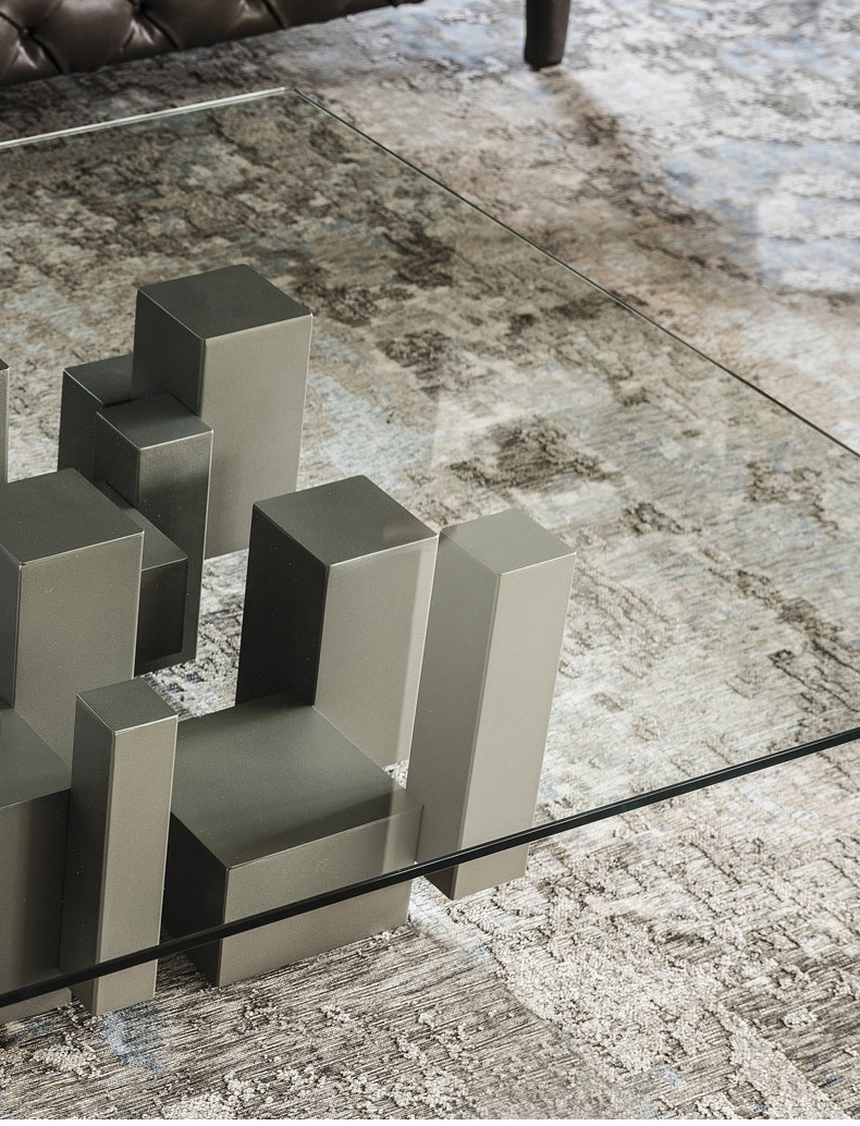 Журнальный столик с основанием из титановой, графитовой или черной окрашенной стали с тиснением. Прозрачный стеклянный верх.