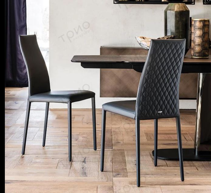 Мягкий стул со стальной конструкцией, полностью обтянутый тканью, экокожей, синтетическим нубуком, микронубуком или кожей.