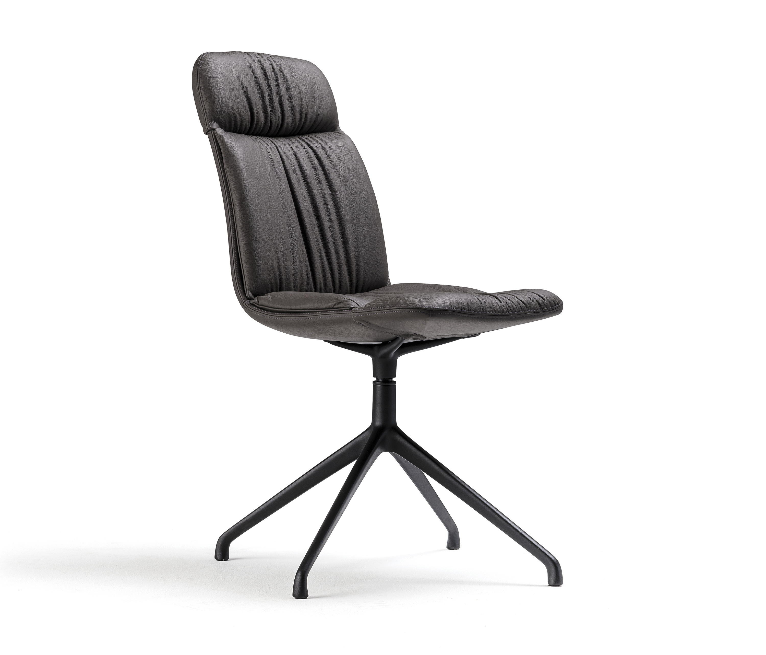 Стул с титановым, графитовым, белым или черным стальным каркасом с тиснением, окрашенным. Обивка тканью, синтетическим нубуком, микронубуком, экокожей или кожей.