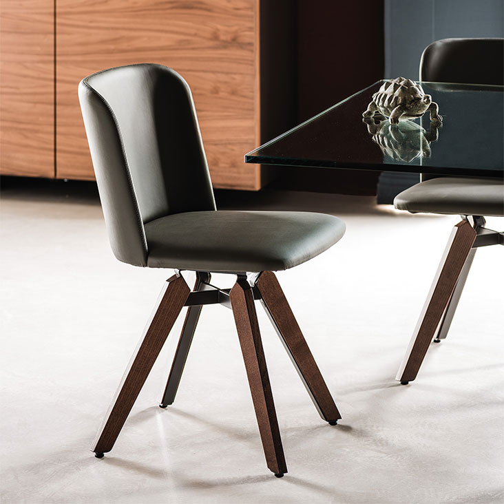Вращающийся стул с подлокотниками или без них на стальной раме с тиснением в графитовый или белый цвет. Ножки из натурального ясеня, матового белого или черного лака с открытыми порами. Сиденье и спинка обиты тканью, синтетическим нубуком, микронубуком, экокожей или кожей.