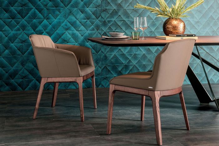 Стул с подлокотниками или без подлокотников со структурой из натурального ясеня, окрашенного под орех или в цвет обожженного дуба, матового белого или черного лакированного с открытыми порами. Сиденье и спинка обиты тканью, синтетическим нубуком, микронубуком, экокожей или кожей.