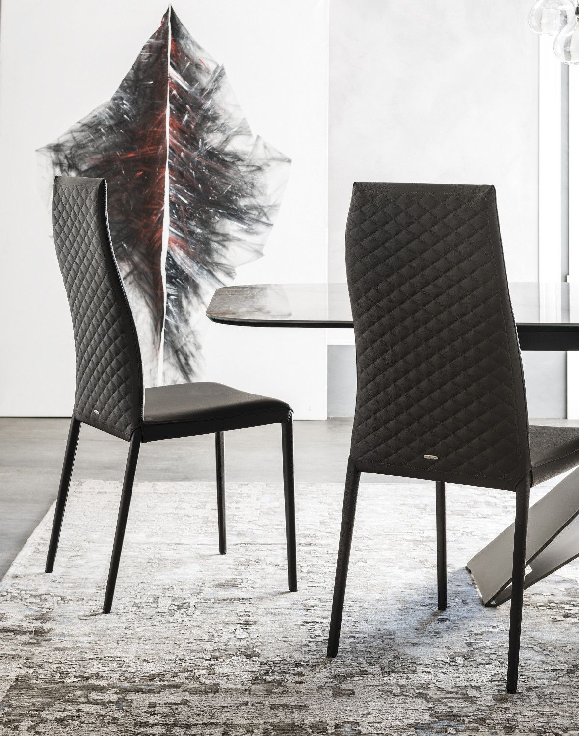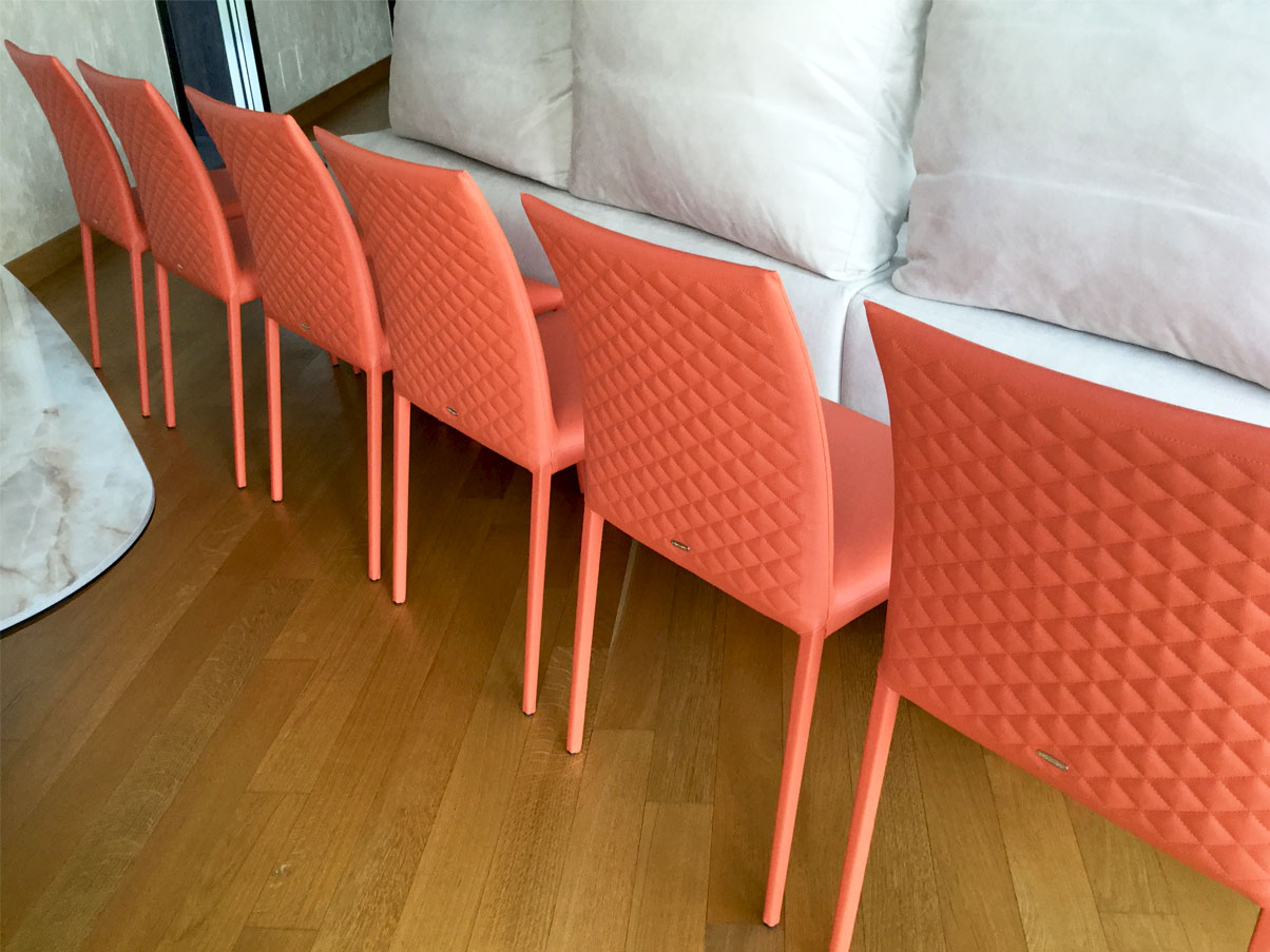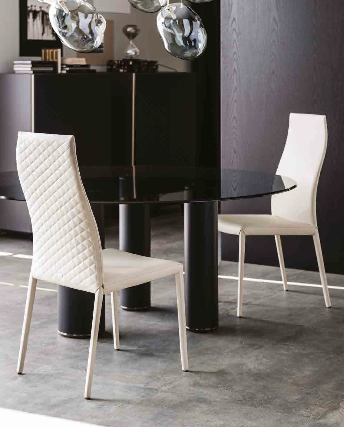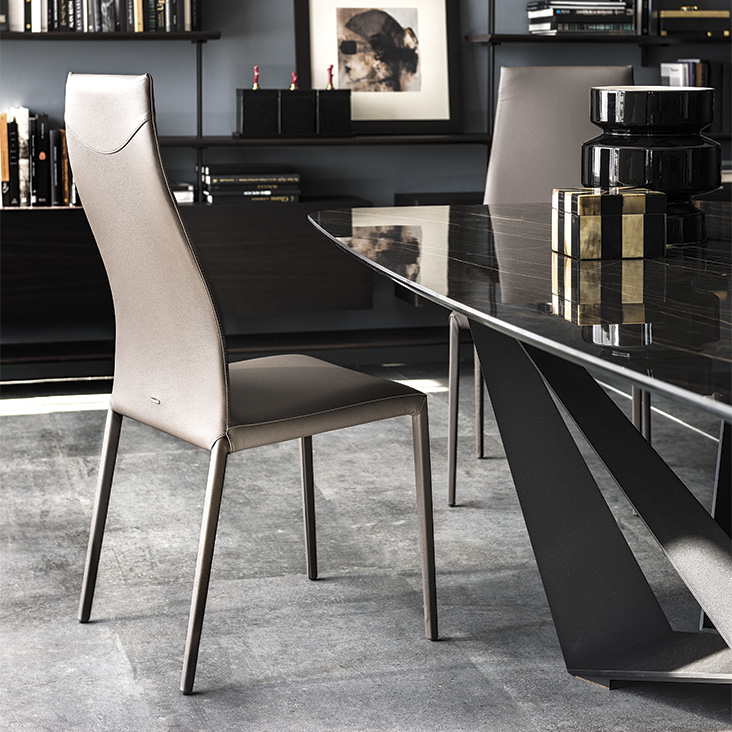 Мягкий стул с подлокотниками или без них со стальным каркасом, полностью обтянутым экокожей, синтетическим нубуком, микронубуком или кожей в. Стеганая спинка.