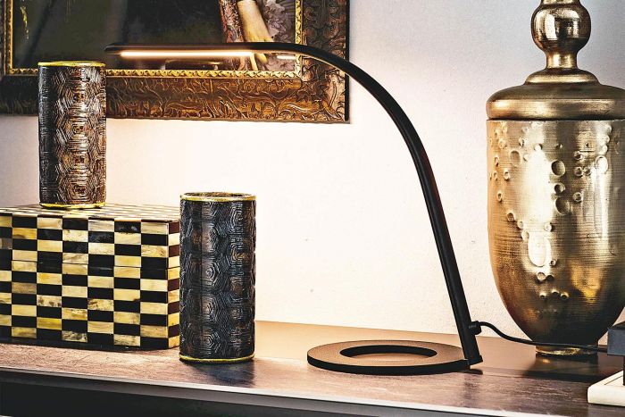 Настольная лампа со структурой из титана, графита или стали с тиснением, окрашенной в черный цвет. Светодиодное освещение, светодиод в комплекте.