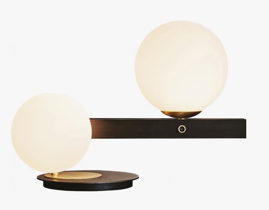Настольная лампа с каркасом из полированного железа и деталями из матовой латуни. Абажуры из сатинированного белого дутого стекла. Лампочки в комплекте.