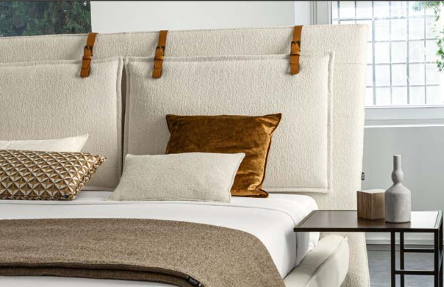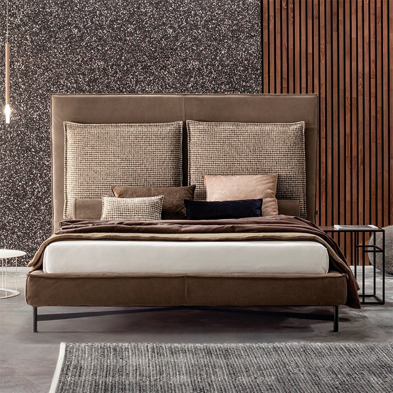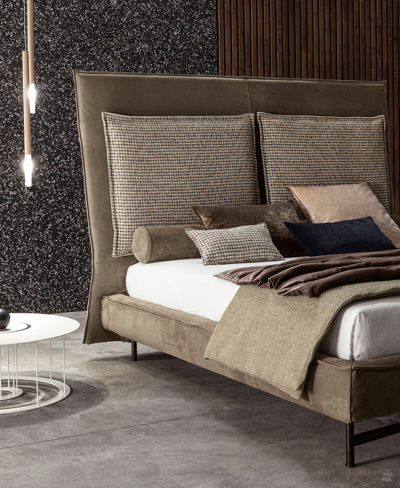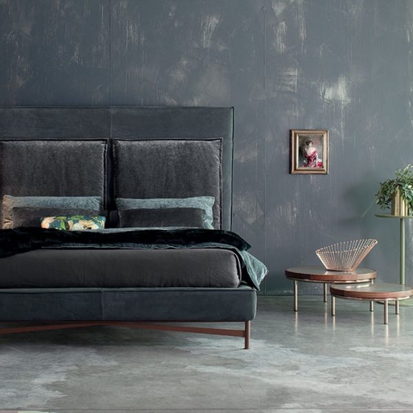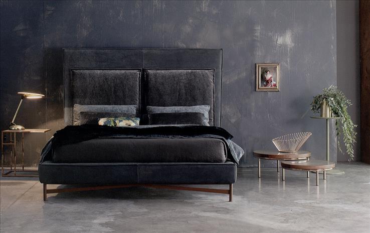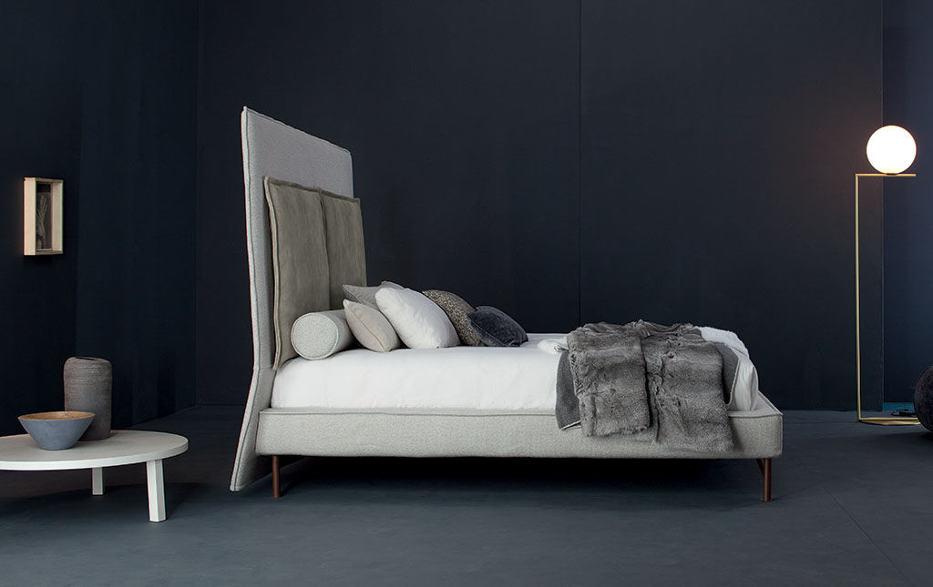 Двуспальная кровать с металлическими ножками, обитым высоким изголовьем и основанием. Изголовье, возвышающееся над кроватью, изгибается под углом, создавая силуэт, профиль которого напоминает крыло чайки. B. Под заказ возможны разные размеры кровати, множество вариантов ткани и кожи, а так же их сочетание. Возможна также кровать с боксом для белья (но без высоких ножек). Чехлы на двух подушках на изголовье можно легко снять для чистки или для придания нового вида.